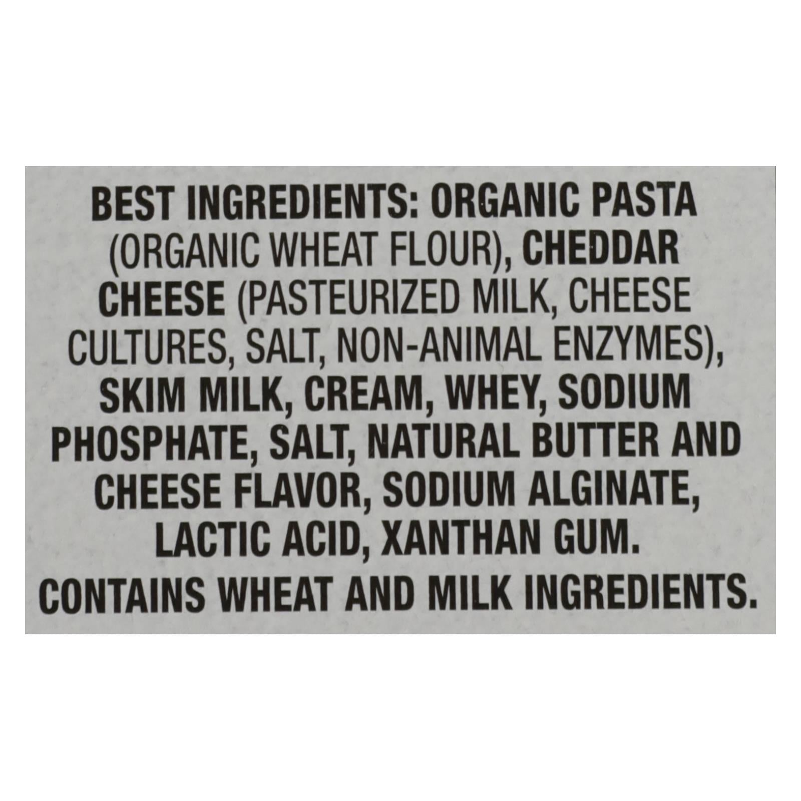 ingredients : organic pasta;organic wheat flour;cheddar cheese;pasteurized milk;cheese cultures;salt;non-animal enzymes;skim milk;cream;whey;sodium phosphate;natural butter and cheese flavor;sodium alginate;lactic acid;xanthan gum