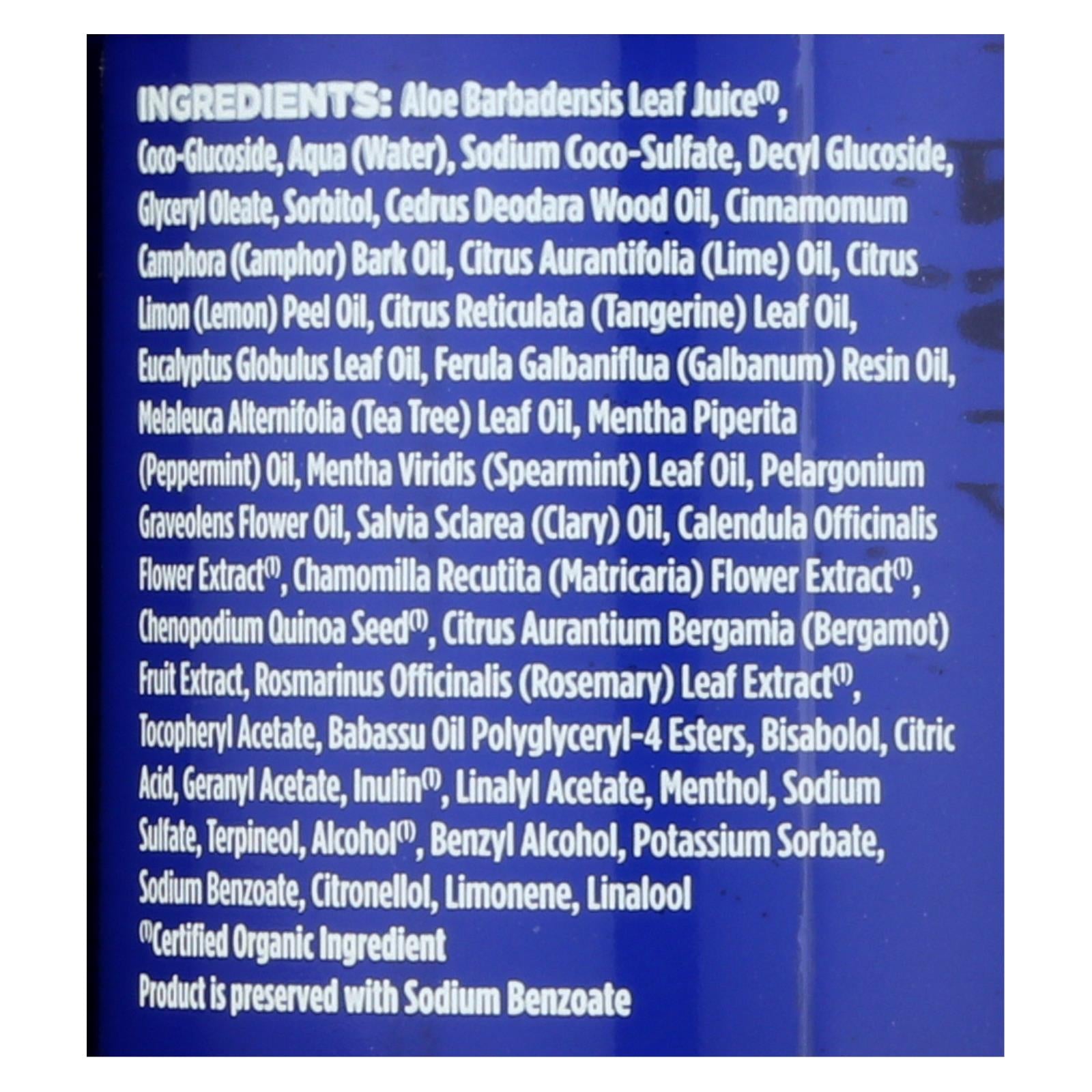 ingredients : aloe barbadensis leaf juice⁽¹⁾;coco-glucoside;aqua;water;sodium coco-sulfate;decyl glucoside;glyceryl oleate;sorbitol;cedrus deodara wood oil;cinnamomum camphora;camphor;bark oil;citrus aurantifolia;lime;oil;citrus limon;lemon;peel oil;citrus reticulata;tangerine;leaf oil;eucalyptus globulus leaf oil;ferula galbaniflua;galbanum;resin oil;melaleuca alternifolia;tea tree;mentha piperita;peppermint;mentha viridis;spearmint;pelargonium graveolens flower oil;salvia sclarea;clary;calendula officinalis