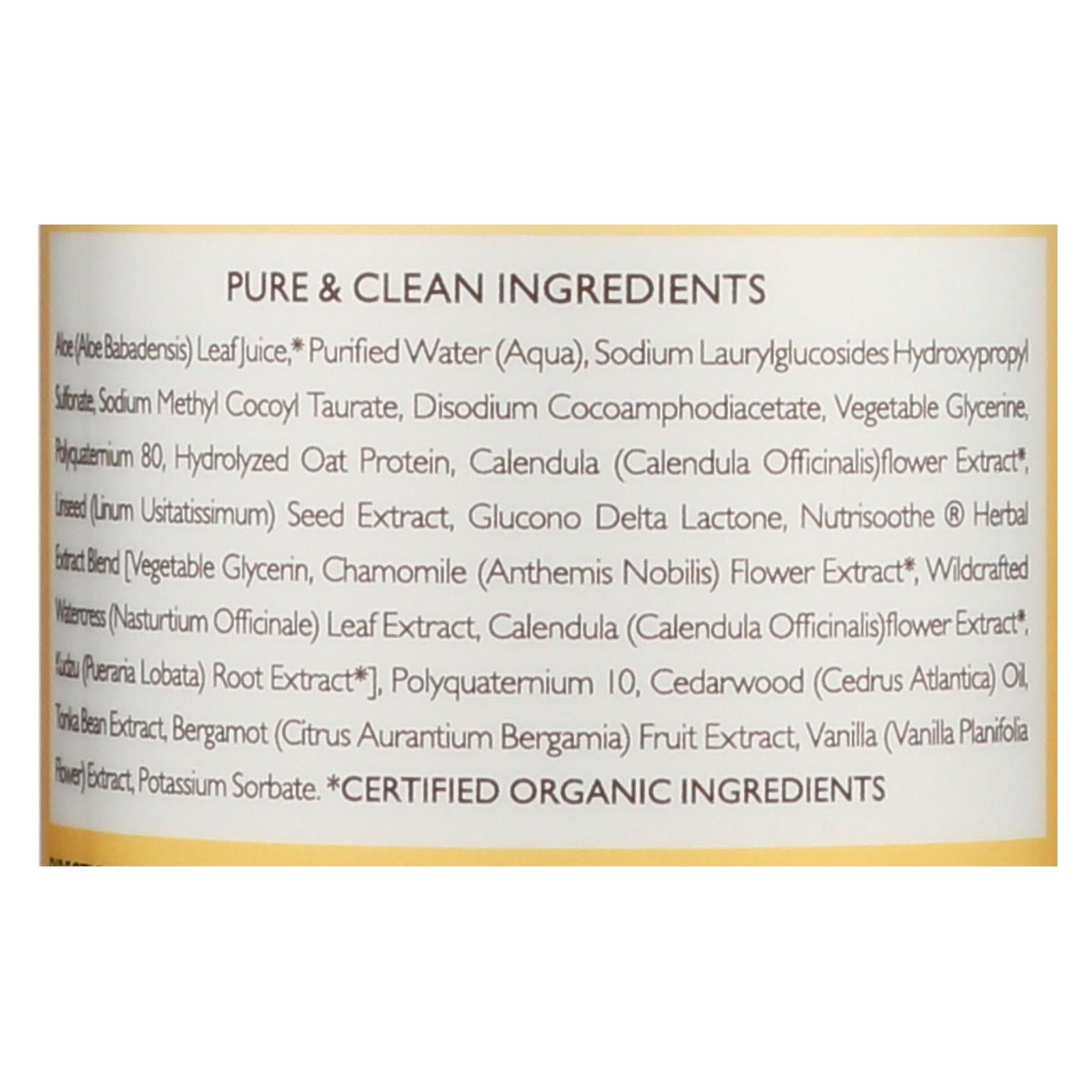 ingredients : pure & clean aloe;aloe babadensis;leaf juice;purified water;aqua;sodium laurylglucosides hydroxypropyl sulfonate;sodium methyl cocoyl taurate;disodium cocoamphodiacetate;vegetable glycerine;polyquatemium 80;hydrolyzed oat protein;calendula;calendula officinalis;flower extract;linseed;linum usitatissimum;seed extract;glucono delta lactone;nutrisoothe ® herbal extract blend [vegetable glycerin;chamomile;anthemis nobilis;wildcrafted watercress;nasturtium officinale;leaf extract;kudzu;pueraria