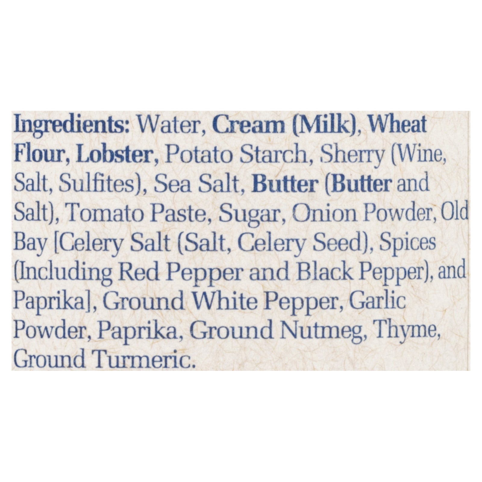 ingredients : water;cream (milk);wheat flour;lobster;potato starch;sherry (wine, salt, sulfites);sea salt;butter (butter and salt);tomato paste;sugar;onion powder;old bay [celery salt (salt, celery seed), spices (including red pepper and black pepper), and paprika];ground white pepper;garlic powder;paprika;ground nutmeg;thyme;ground turmeric