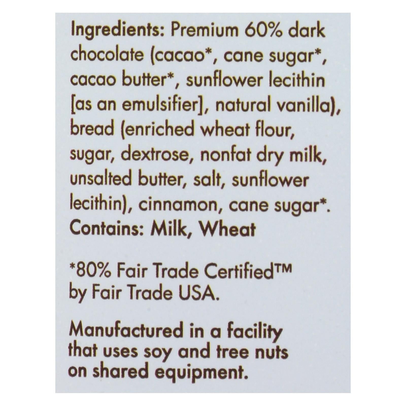 ingredients : premium 60% dark chocolate;cacao;cane sugar;cacao butter;sunflower lecithin [as an emulsifier];natural vanilla;bread;enriched wheat flour;sugar;dextrose;nonfat dry milk;unsalted butter;salt;sunflower lecithin;cinnamon