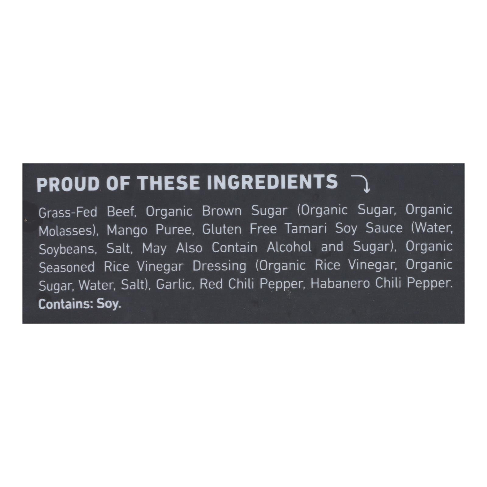 ingredients : grass-fed beef;organic brown sugar;organic sugar;organic molasses;mango puree;gluten free tamari soy sauce;water;soybeans;salt;may also contain alcohol and sugar;organic seasoned rice vinegar dressing;organic rice vinegar;garlic;red chili pepper;habanero chili pepper