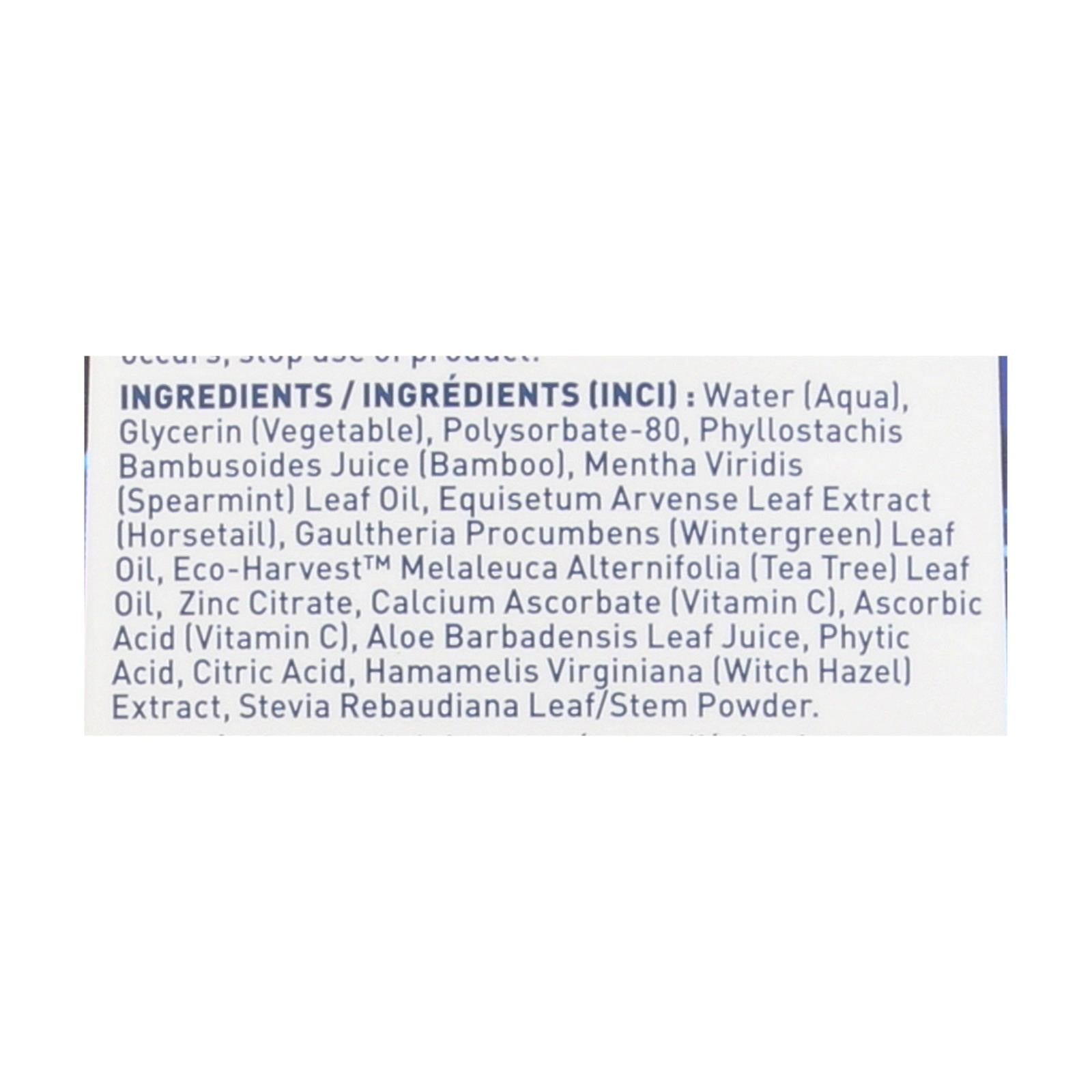 ingredients : water;aqua;glycerin;vegetable;polysorbate-80;phyllostachis bambusoides juice;bamboo;mentha viridis;spearmint;leaf oil;equisetum arvense leaf extract;horsetail;gaultheria procumbens;wintergreen;eco - harvest™ melaleuca alternifolia;tea tree;zinc citrate;calcium ascorbate;vitamin c;ascorbic acid;aloe barbadensis leaf juice;phytic acid;citric acid;hamamelis virginiana;witch hazel;extract;stevia rebaudiana leaf/stem powder