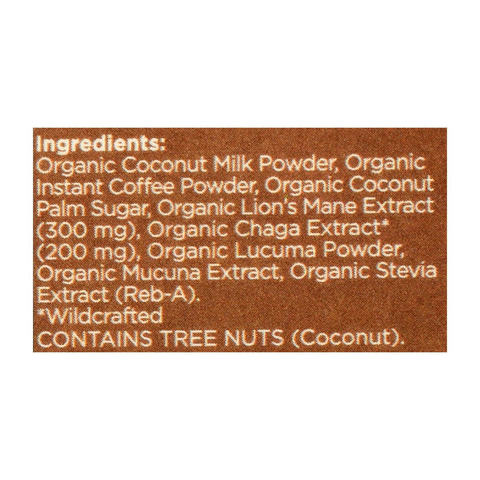 ingredients : organic coconut milk powder;organic instant coffee powder;organic coconut palm sugar;organic lion's mane extract;300 mg;organic chaga extract;200 mg;organic lucuma powder;organic mucuna extract;organic stevia extract;reb-a