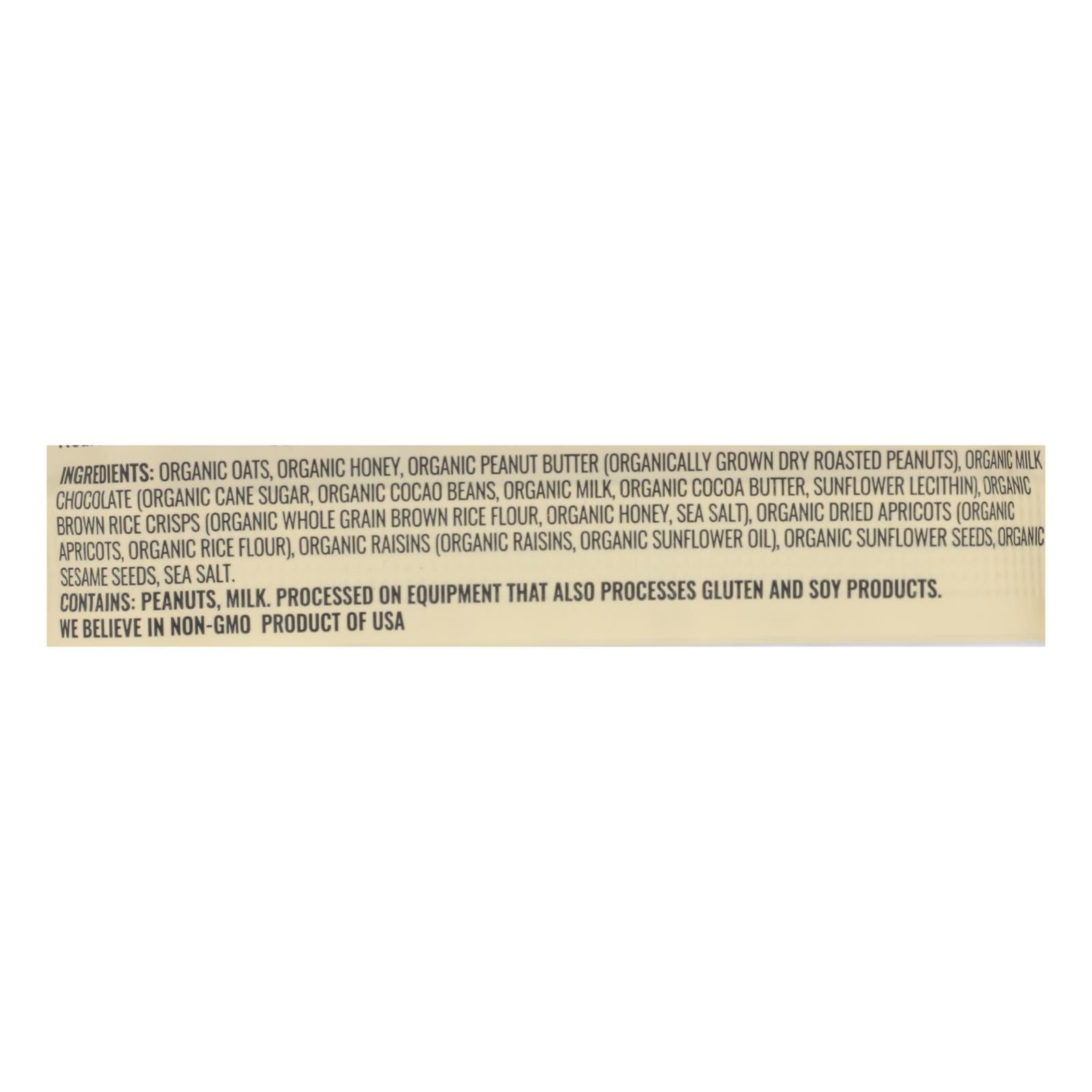 ingredients : organic oats;organic honey;organic peanut butter (organically grown dry roasted peanuts);organic milk chocolate (organic cane sugar, organic cocao beans, organic milk, organic cocoa butter, sunflower lecithin);organic brown rice crisps (organic whole grain brown rice flour, organic honey, sea salt);organic dried apricots (organic apricots, organic rice flour);organic raisins (organic raisins, organic sunflower oil);organic sunflower seeds;organic sesame seeds;sea salt