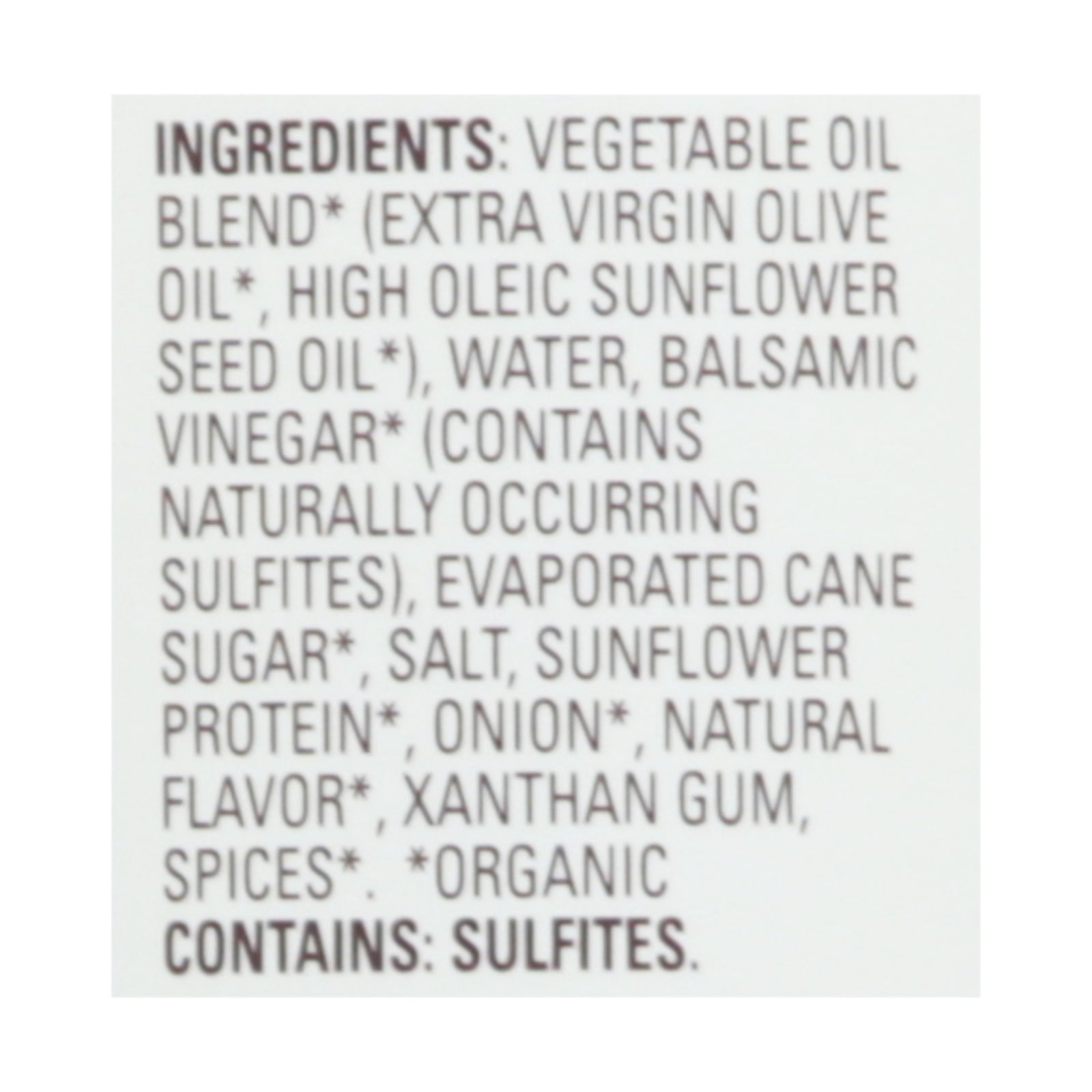 ingredients : vegetable oil blend* (extra virgin olive oil*, high oleic sunflower seed oil*);water;balsamic vinegar* (contains naturally occurring sulfites);evaporated cane sugar;salt;sunflower protein;onion;natural flavor;xanthan gum;spices