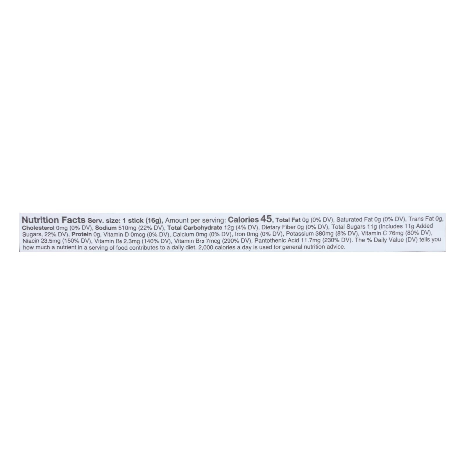 ingredients : pure cane sugar;dextrose;citric acid;salt;potassium citrate;sodium citrate;dipotassium phosphate;silicon dioxide;rebaudioside-a (stevia leaf extract);natural acai flavor;vitamin c (ascorbic acid);vitamin b3 (niacinamide);vitamin b5 (d-calcium pantothenate);vitamin b6 (pyridoxine hydrochloride);vitamin b12 (cyanocobalamin)