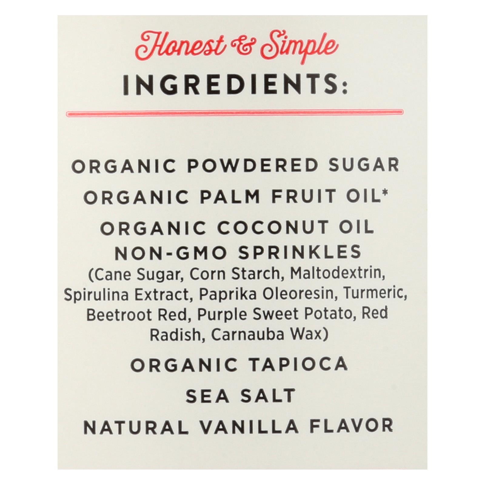ingredients : organic powdered sugar organic palm fruit oil* organic coconut oil non-gmo sprinkles;cane sugar;corn starch;maltodextrin;spirulina extract;paprika oleoresin;turmeric;beetroot red;purple sweet potato;red radish;carnauba wax;organic tapioca sea salt natural vanilla flavor