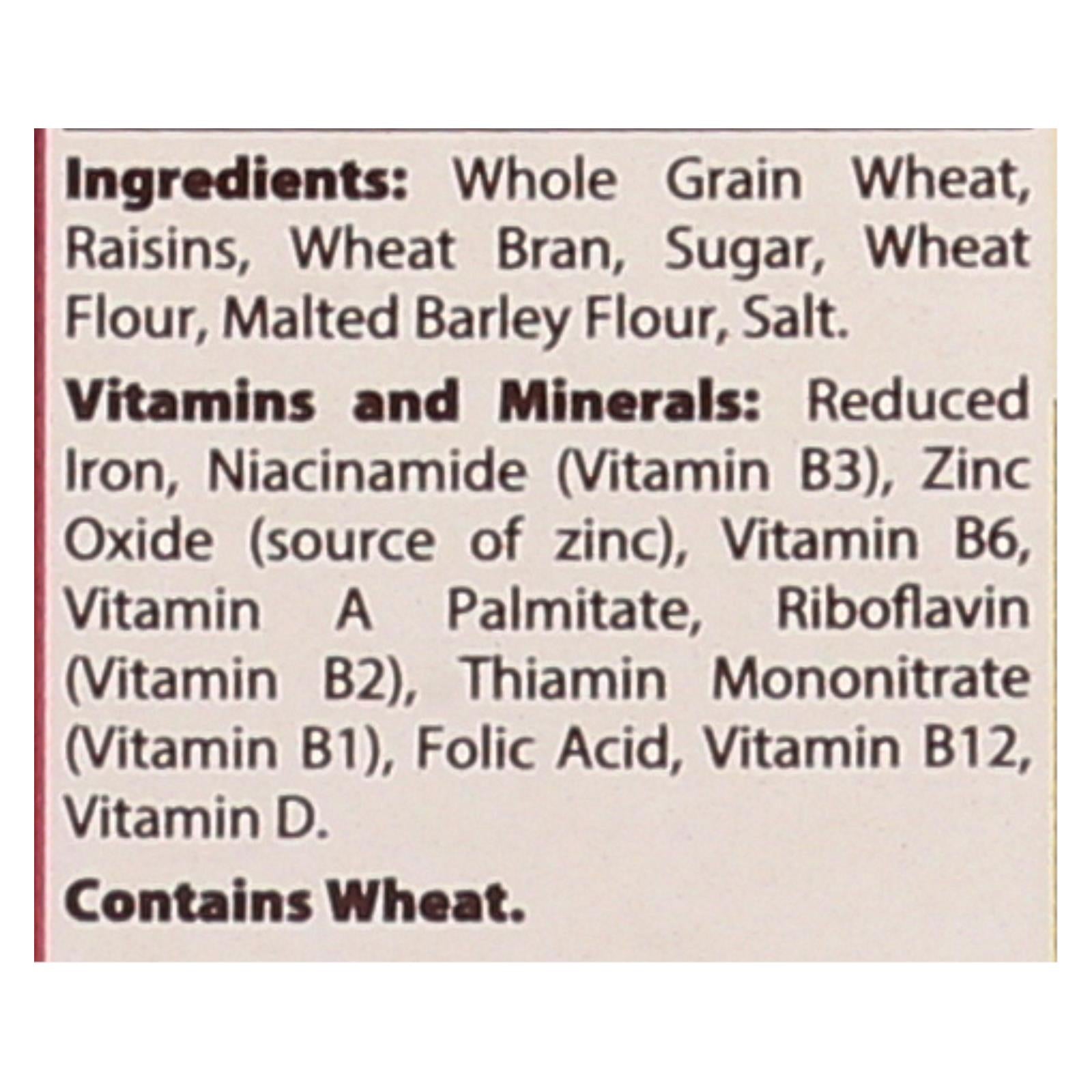 ingredients : reduced iron;thiamin mononitrate (vitamin b1);niacinamide (vitamin b3);calcium pantothenate (vitamin b5);pyridoxine hydrochloride (vitamin b6);folic acid;whole grain wheat;raisins;wheat bran;sugar;barley malt extract;salt