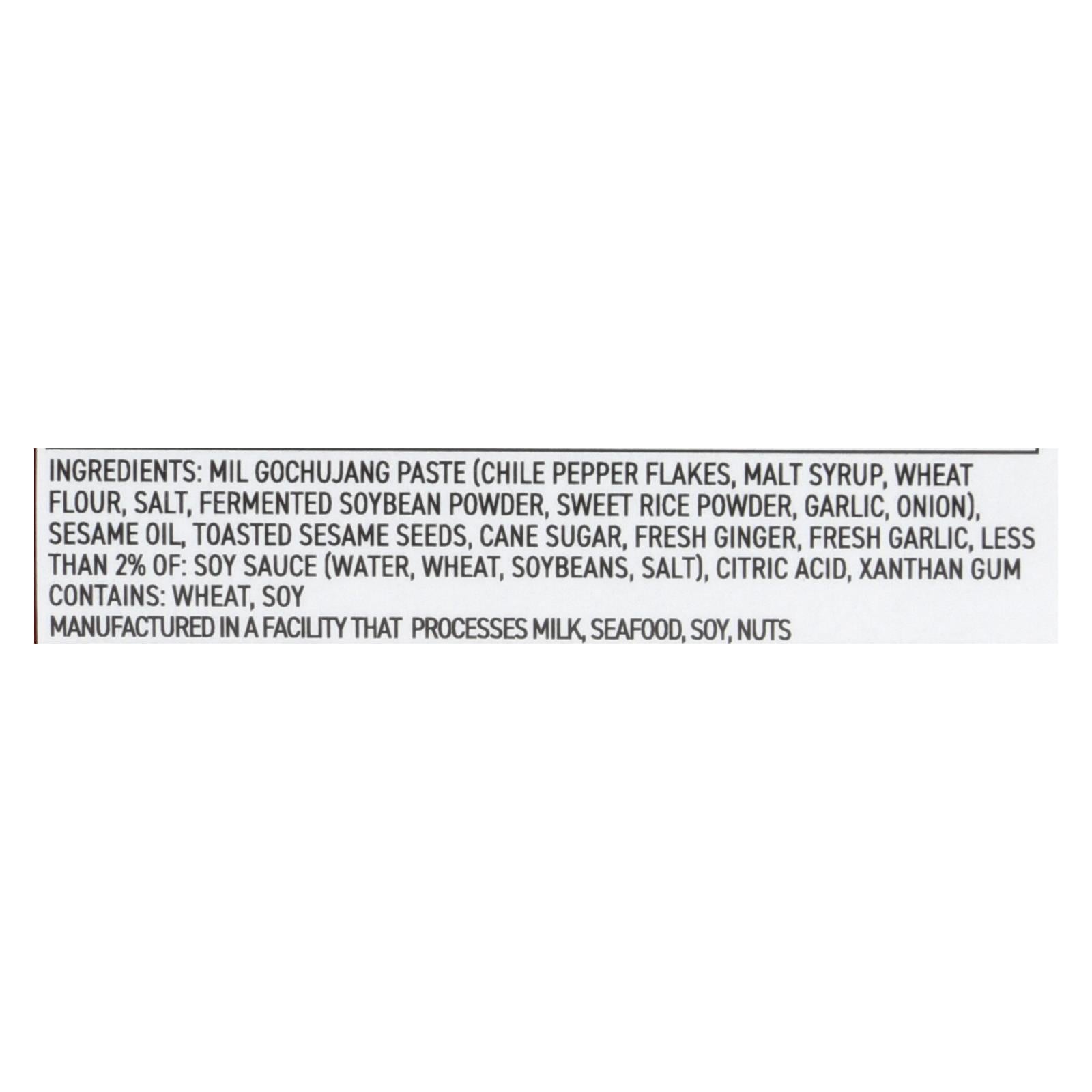 ingredients : mil gochujang paste;chile pepper flakes;malt syrup;wheat flour;salt;fermented soybean powder;sweet rice powder;garlic;onion;sesame oil;toasted sesame seeds;cane sugar;fresh ginger;fresh garlic;less than 2% of: soy sauce;water;wheat;soybeans;citric acid;xanthan gum