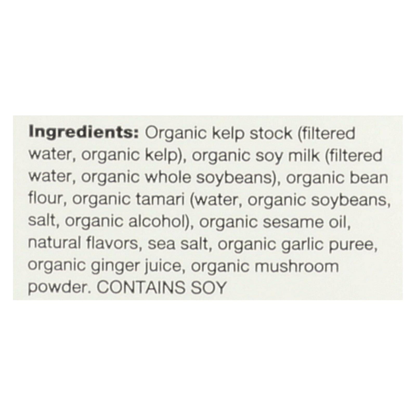 ingredients : organic kelp stock;filtered water;organic kelp;organic soy milk;organic whole soybeans;organic bean flour;organic tamari;water;organic soybeans;salt;organic alcohol;organic sesame oil;natural flavors;sea salt;organic garlic puree. Organic ginger juice. Organic mushroom powder