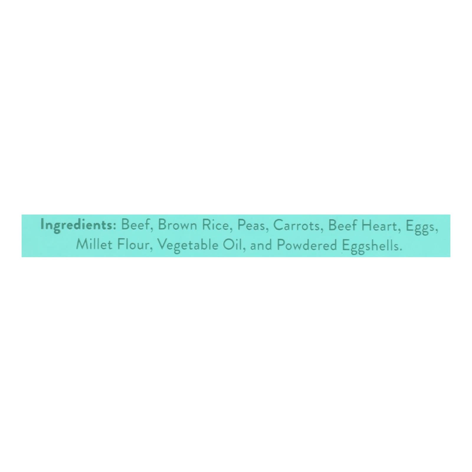 ingredients : beef;brown rice;peas;carrots;beef heart;eggs;millet flour;vegetable oil;and powdered eggshells