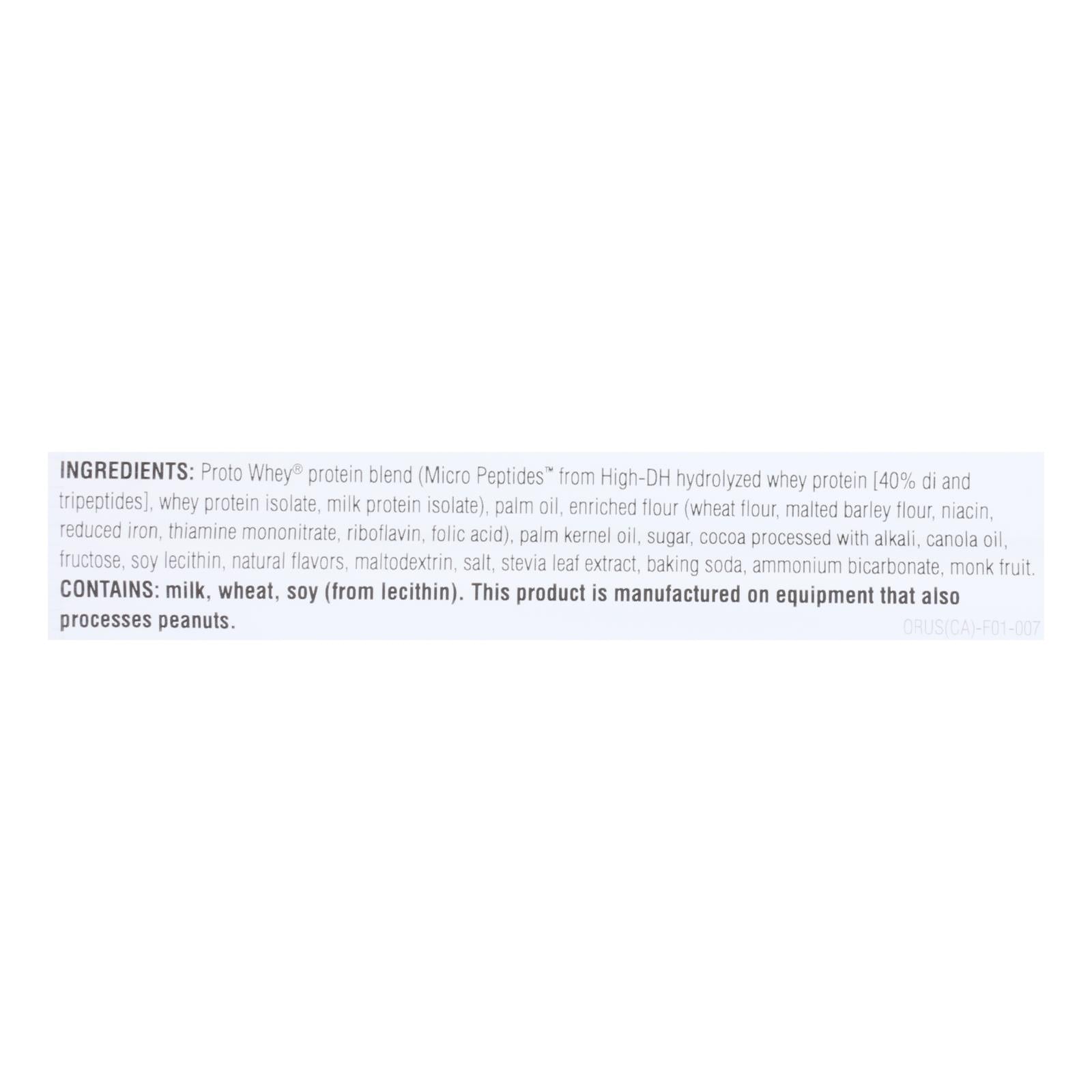 ingredients : proto whey protein blend (micro peptides from high-dh hydrolyzed whey protein, whey protein isolate, milk protein isolate);palm oil;enriched flour (wheat flour, malted barley flour, niacin, reduced iron, thiamine mononitrate, riboflavin, folic acid);palm kernel oil;sugar;cocoa processed with alkali;canola oil;fructose;soy lecithin;natural flavors;maltodextrin;salt;stevia leaf extract;baking soda;ammonium bicarbonate;monk fruit