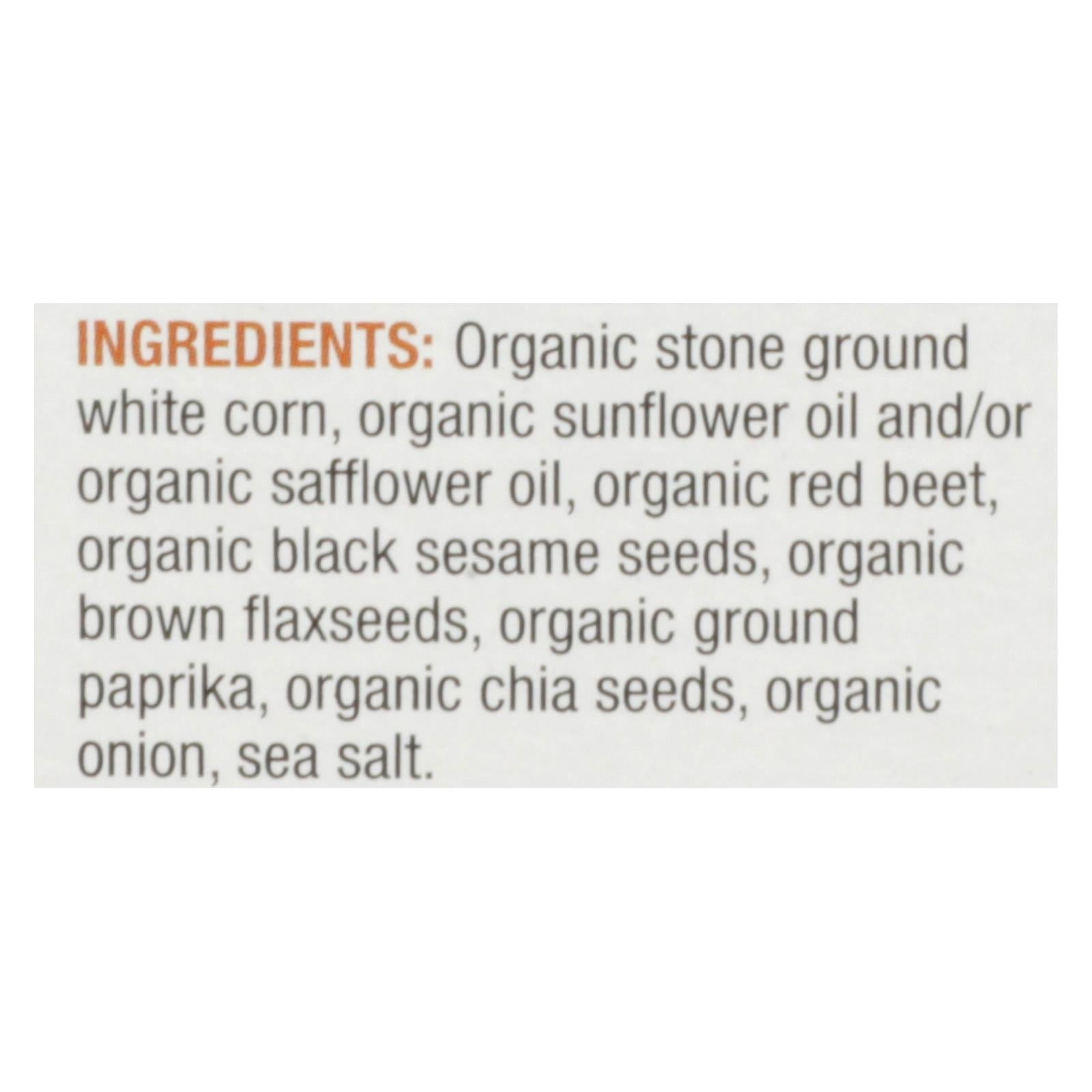 ingredients : organic stone ground white corn;organic sunflower and/or organic safflower oil;organic red beet;organic black sesame seeds;organic brown flaxseeds;organic ground paprika;organic chia seeds;organic onion;sea salt