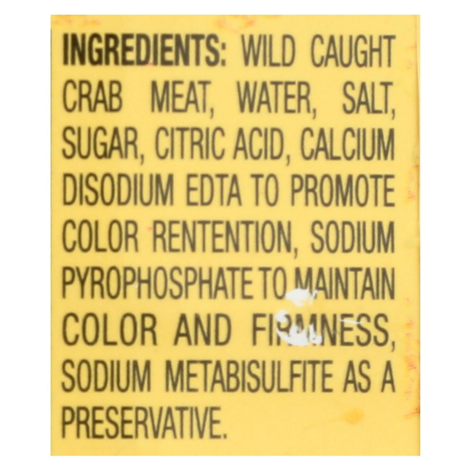 ingredients : wild caught crab meat;water;salt;sugar;citric acid;calcium disodium edta to promote color retention;sodium pyrophosphate to maintain color and firmness;sodium metabisulfite as a preservative