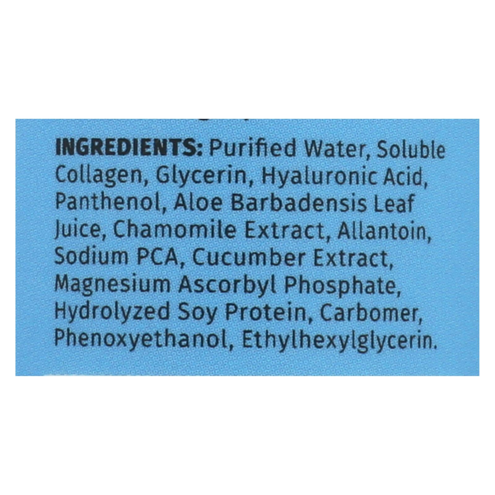 ingredients : purified water;soluble collagen;glycerin;hyaluronic acid;panthenol;aloe barbadensis leaf juice;chamomile extract;allantoin;sodium pca;cucumber extract;magnesium ascorbyl phosphate;hydrolyzed soy protein;carbomer;phenoxyethanol;ethylhexylglycerin