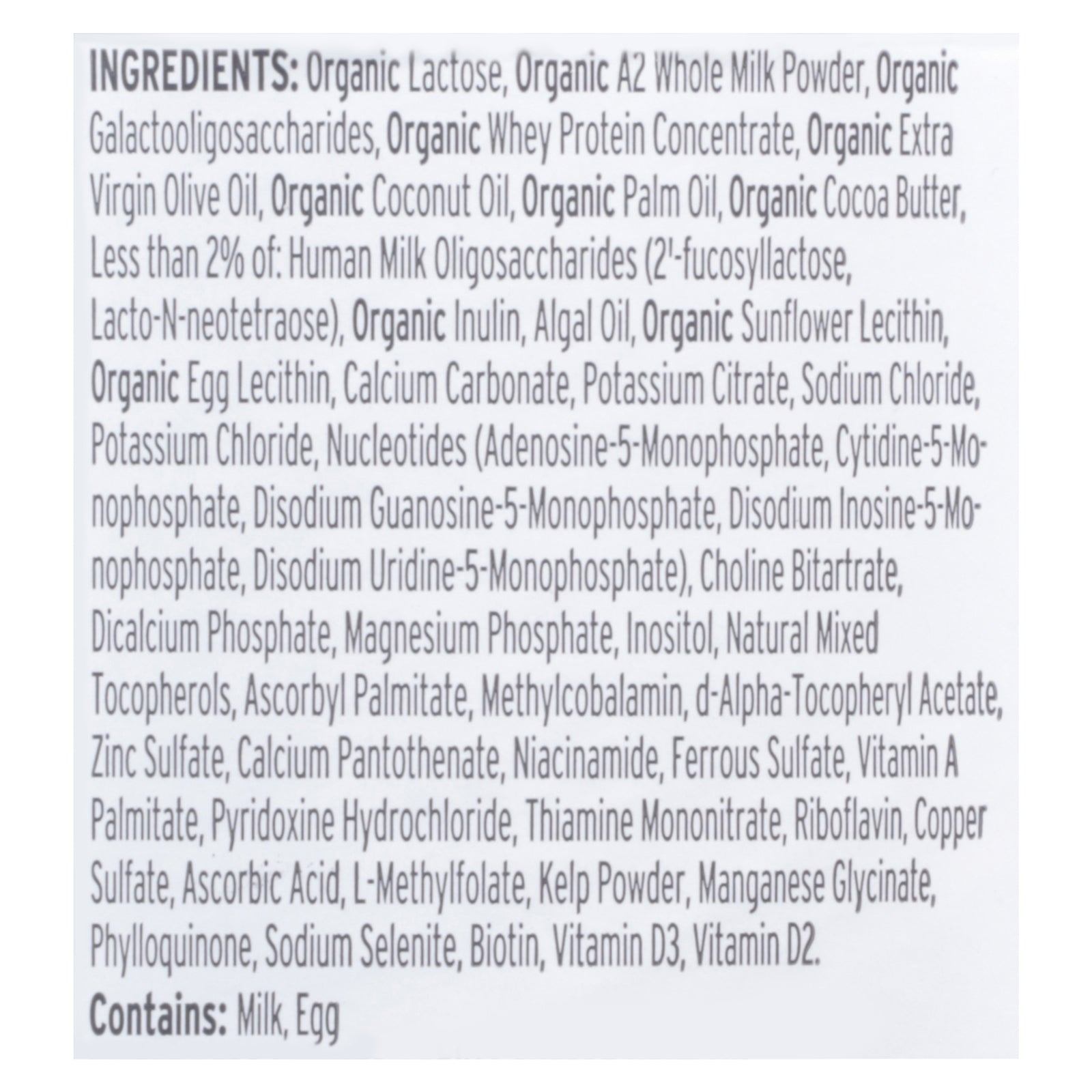 ingredients : organic lactose;organic a2 whole milk powder;organic galactooligosaccharides;organic whey protein concentrate;organic extra virgin olive oil;organic coconut oil;organic palm oil;organic cocoa butter;less than 2% of: human milk oligosaccharides (2'-fucosyllactose, lacto-n-neotetraose), organic inulin, algal oil, organic sunflower lecithin, organic egg lecithin, calcium carbonate, potassium citrate, sodium chloride, potassium chloride, nucleotides (adenosine-5-monophosphate, cytidine-5-monophospha