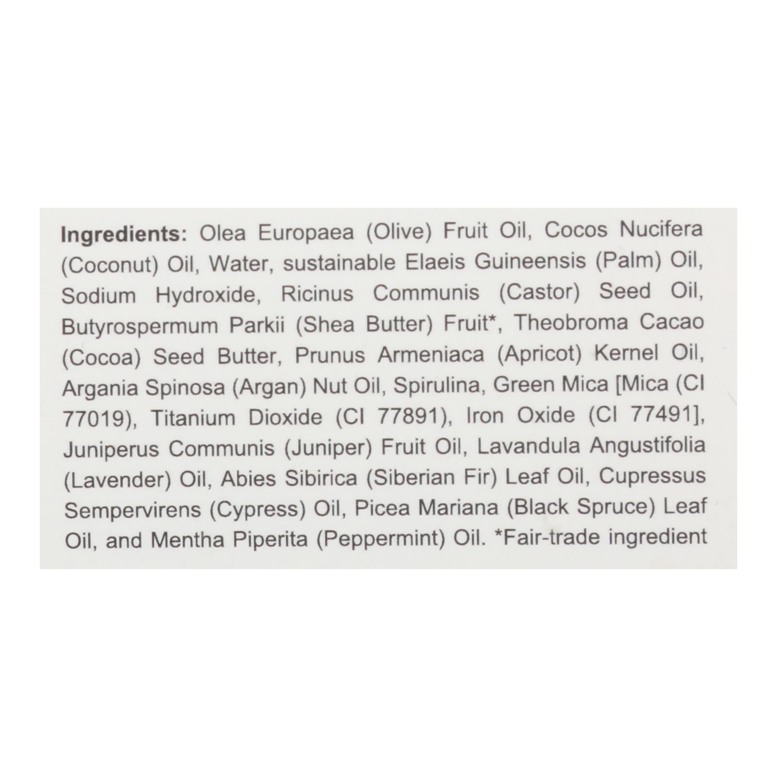 ingredients : olea europaea (olive) fruit oil;cocos nucifera (coconut) oil;water;sustainable elaeis guineensis (palm) oil;sodium hydroxide;ricinus communis (castor) seed oil;butyrospermum parkii (shea butter) fruit;theobroma cacao (cocoa) seed butter;prunus armeniaca (apricot) kernel oil;argania spinosa (argan) nut oil;spirulina;green mica [mica (ci 77019), titanium dioxide (ci 77891), iron oxide (ci 77491];juniperus communis (juniper) fruit oil;lavandula angustifolia (lavender) oil;abies sibirica (siberianf