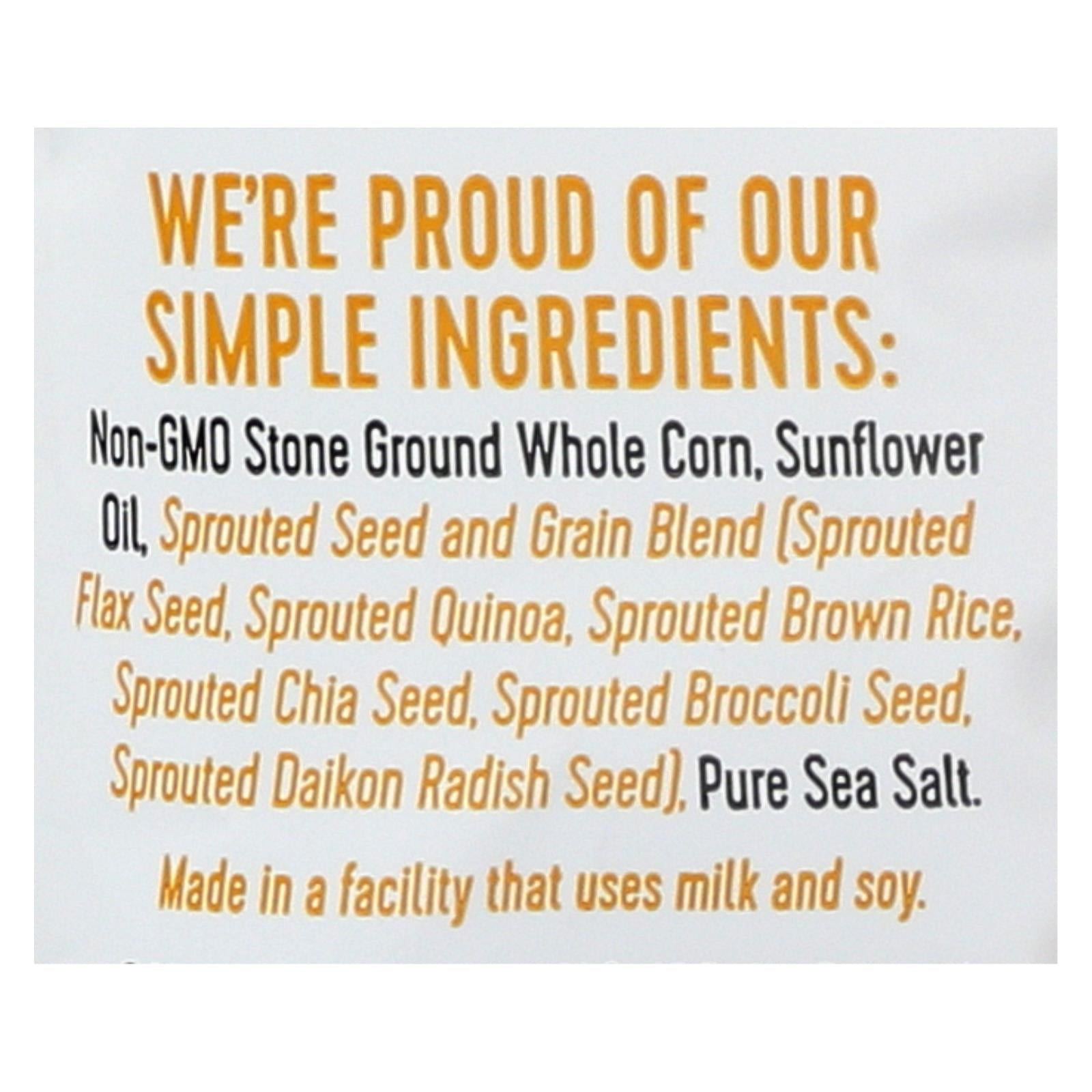 ingredients : non-gmo stone ground whole corn;sunflower oil;sprouted seed and grain blend [sprouted flax seed;sprouted quinoa;sprouted brown rice;sprouted chia seed;sprouted broccoli seed;sprouted daikon radish seed];pure sea salt