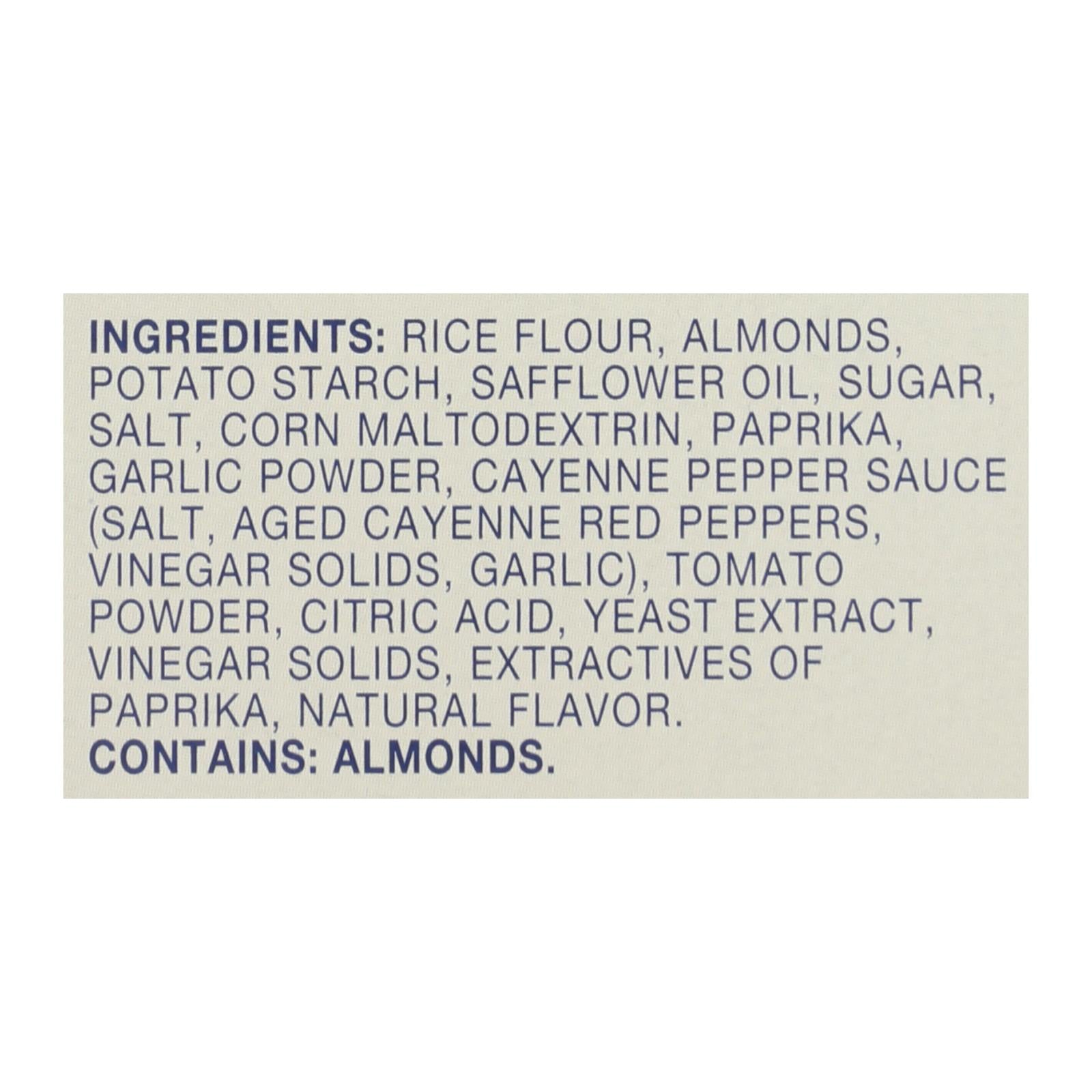 ingredients : rice flour;almonds;potato starch;safflower oil;sugar;salt;corn maltodextrin;paprika;garlic powder;cayenne pepper sauce (salt, aged cayenne red peppers, vinegar solids, garlic);tomato powder;citric acid;yeast extract;vinegar solids;extractives of paprika;natural flavor
