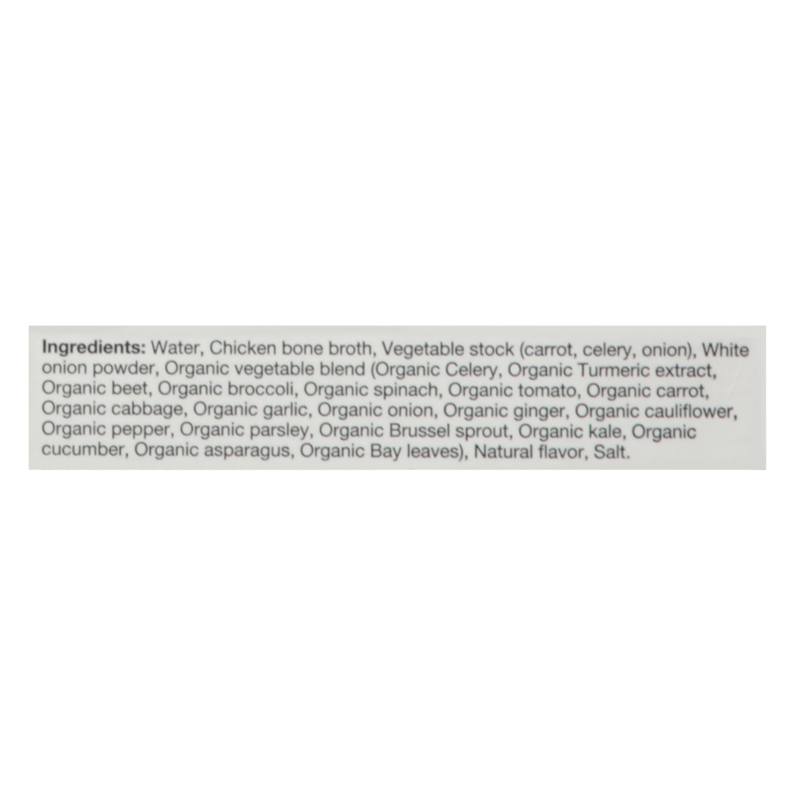 ingredients : water;chicken bone broth;vegetable stock (carrot, celery, onion);white onion powder;organic vegetable blend (organic celery, organic turmeric extract, organic beet, organic broccoli, organic spinach, organic tomato, organic carrot, organic cabbage, organic garlic, organic onion, organic ginger, organic cauliflower, organic pepper, organic parsley, organic brussel sprout, organic kale, organic cucumber, organic asparagus, organic bay leaves);natural flavor;salt