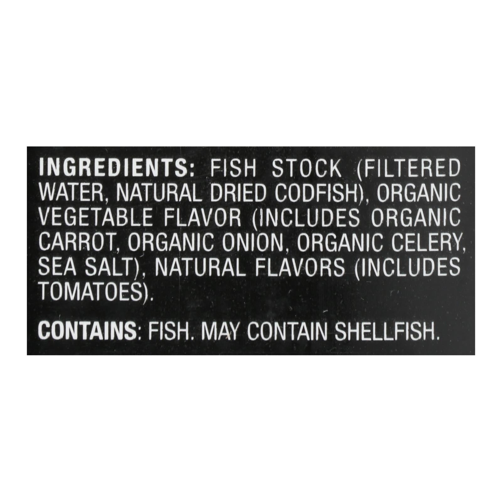 ingredients : fish stock (filtered water, natural dried codfish);organic vegetable flavor (includes organic carrot, organic onion, organic celery, sea salt);natural flavors (includes tomatoes)