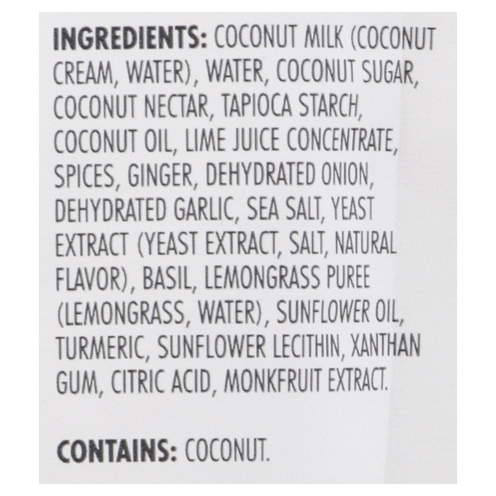 ingredients : coconut milk (coconut cream, water);water;coconut sugar;coconut nectar;tapioca starch;coconut oil;lime juice concentrate;spices;ginger;dehydrated onion;dehydrated garlic;sea salt;yeast extract (yeast extract, salt, natural flavor);basil;lemongrass puree (lemongrass, water);sunflower oil;turmeric;sunflower lecithin;xanthan gum;citric acid;monkfruit extract