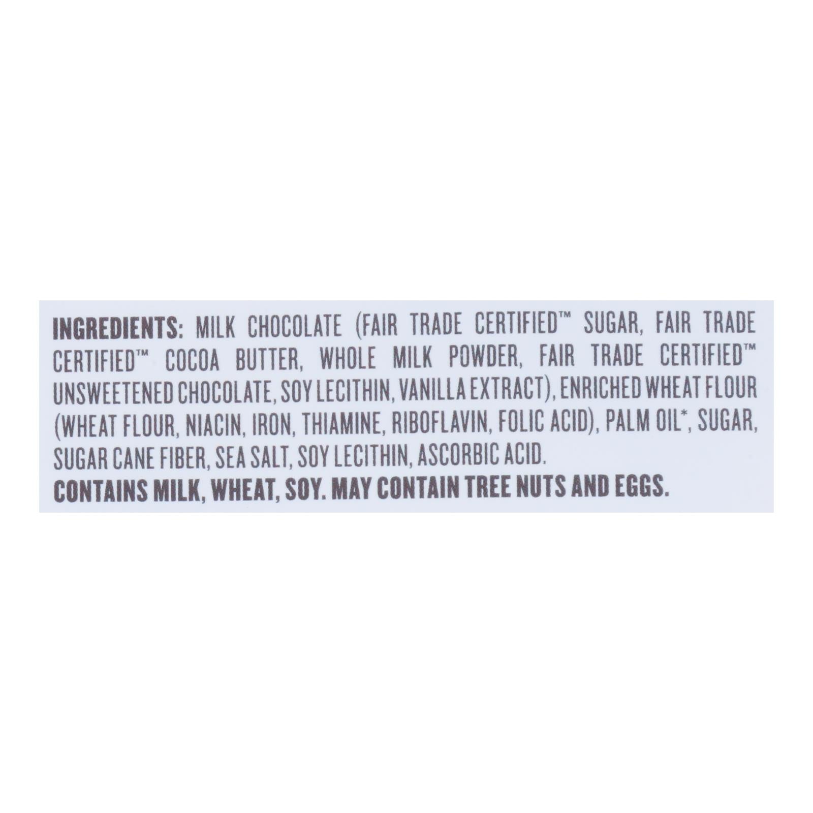 ingredients : milk chocolate (fair trade certified™ sugar, fair trade certified™ cocoa butter, whole milk powder, fair trade certified™ unsweetened chocolate, soy lecithin, vanilla extract);enriched wheat flour (wheat flour, niacin, iron, thiamine, riboflavin, folic acid);palm oil;sugar;sugar cane fiber;sea salt;soy lecithin;ascorbic acid