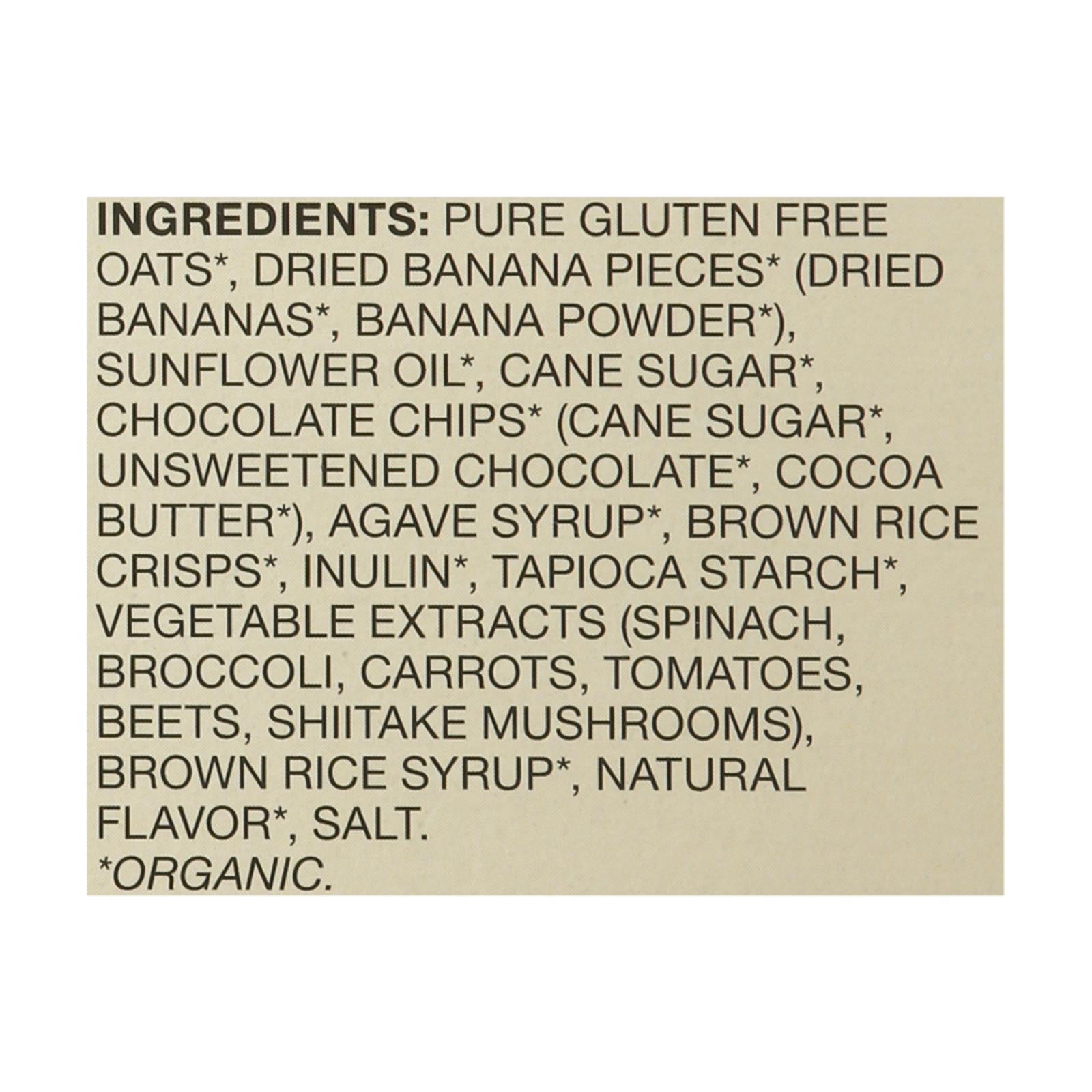 ingredients : pure gluten free oats;dried banana pieces* (dried bananas*, banana powder*);sunflower oil;cane sugar;chocolate chips* (cane sugar*, unsweetened chocolate*, cocoa butter*);agave syrup;brown rice crisps;inulin;tapioca starch;vegetable extracts (spinach, broccoli, carrots, tomatoes, beets, shiitake mushrooms);brown rice syrup;natural flavor;salt