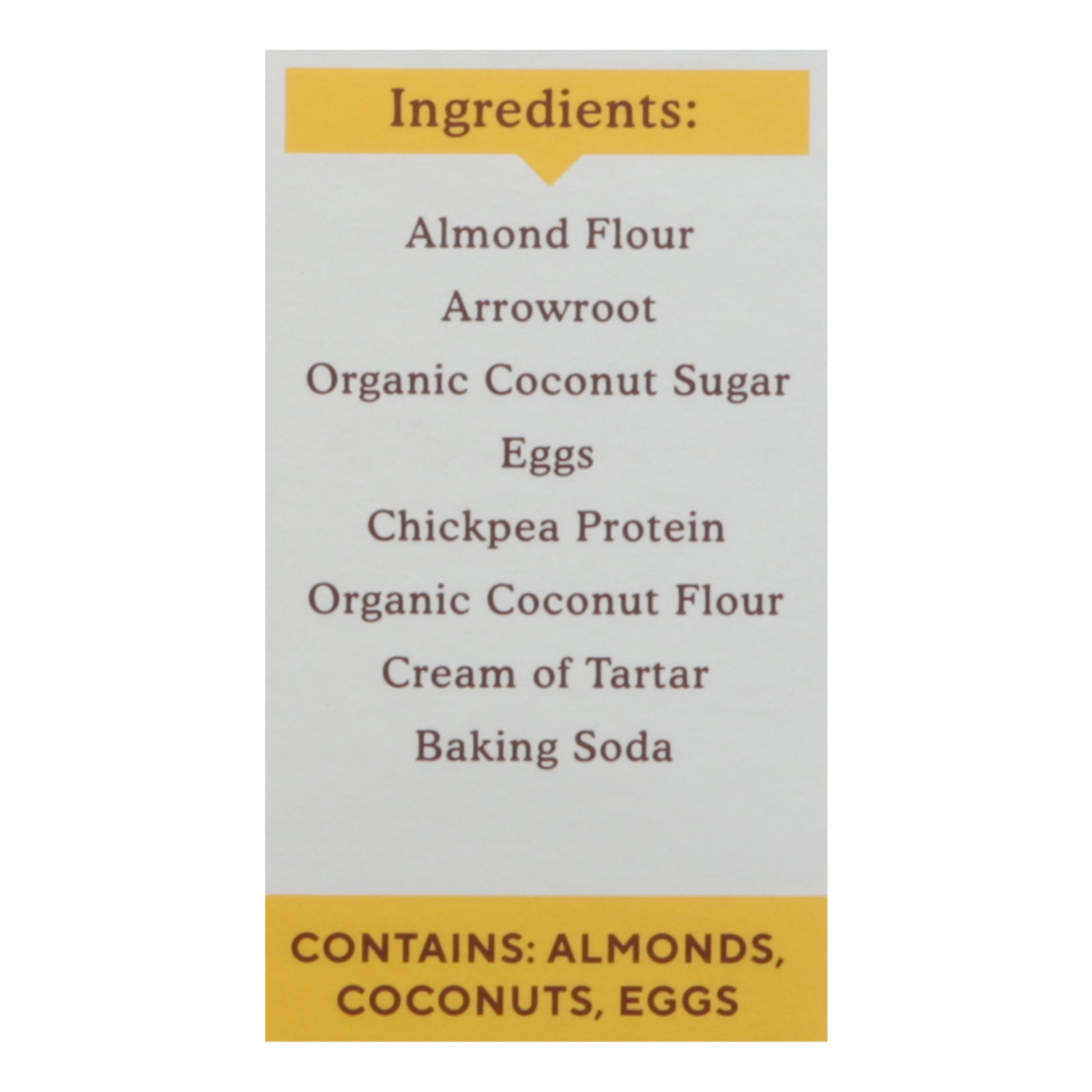 ingredients : almond flour arrowroot organic coconut sugar eggs chickpea protein organic coconut flour cream of tartar baking soda