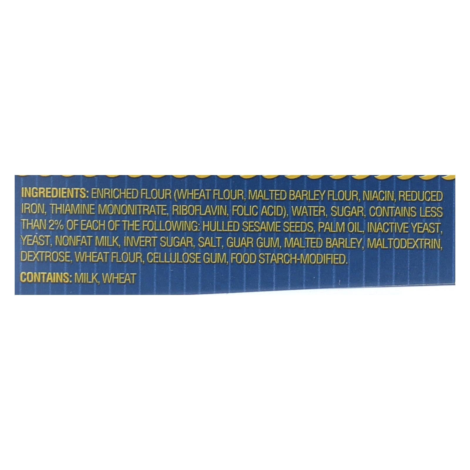 ingredients : enriched flour;wheat flour;malted barley flour;niacin;reduced iron;thiamine mononitrate;riboflavin;folic acid;water;sugars;contains less than 2% of each of the following: hulled sesame seeds;palm oil;inactive yeast;yeast;nonfat milk;invert sugar;salt;guar gum;malted barley;maltodextrin;dextrose;cellulose gum;food starch-modified