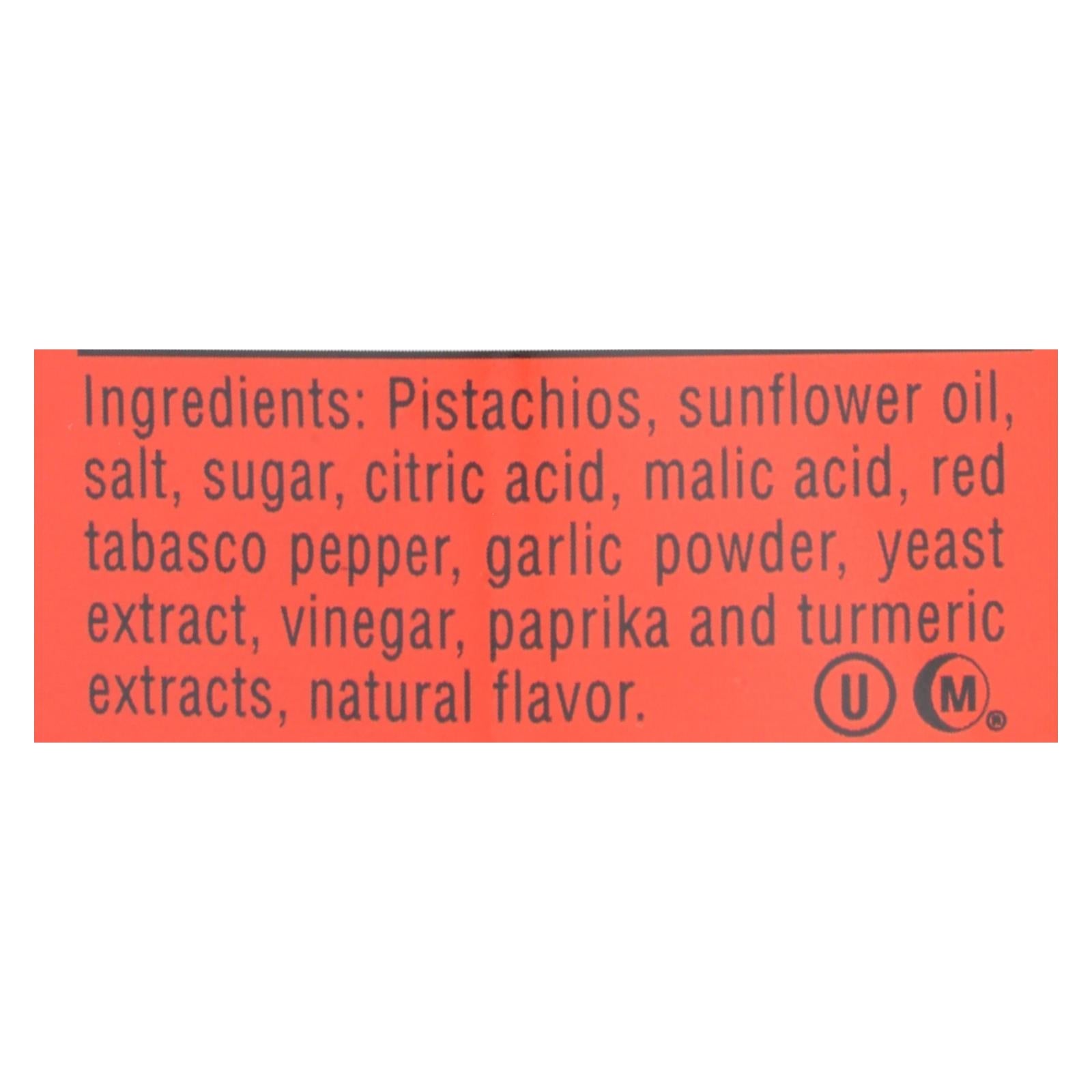 ingredients : pistachios;sunflower oil;salt;sugar;citric acid;malic acid;red tabasco pepper;garlic powder;yeast extract;vinegar;paprika and turmeric extracts;natural flavor