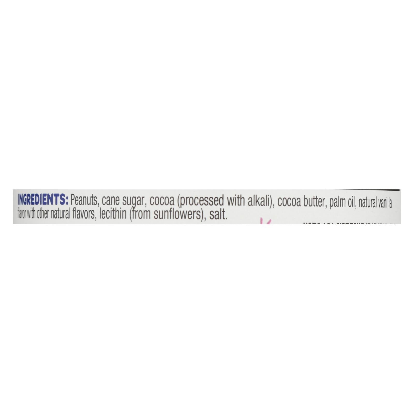 ingredients : peanuts;cane sugar;cocoa;processed with alkali;cocoa butter;palm oil;natural vanilla flavor with other natural flavors;lecithin;from sunflowers;salt