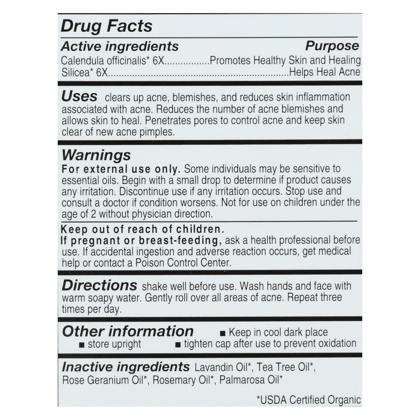 ingredients : calendula officinalis* 6x purpose promotes healthy skin and healing silicea* 6x purpose helps heal acne;lavandin oil;tea tree oil;rose geranium oil;rosemary oil;palmarosa oil