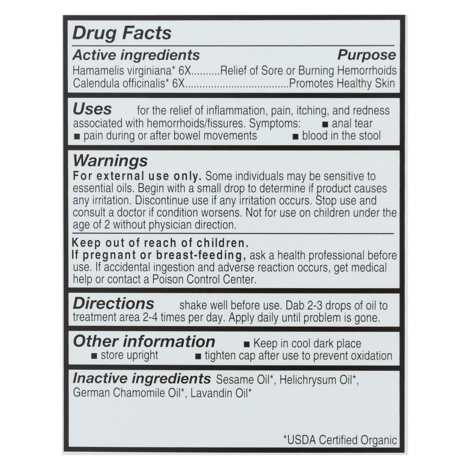 ingredients : hamamelis virginiana* 6x purpose relief of sore or burning hemorrhoids calendula officinalis* 6x purpose promotes healthy skin;sesame oil;helichrysum oil;german chamomile oil;lavandin oil