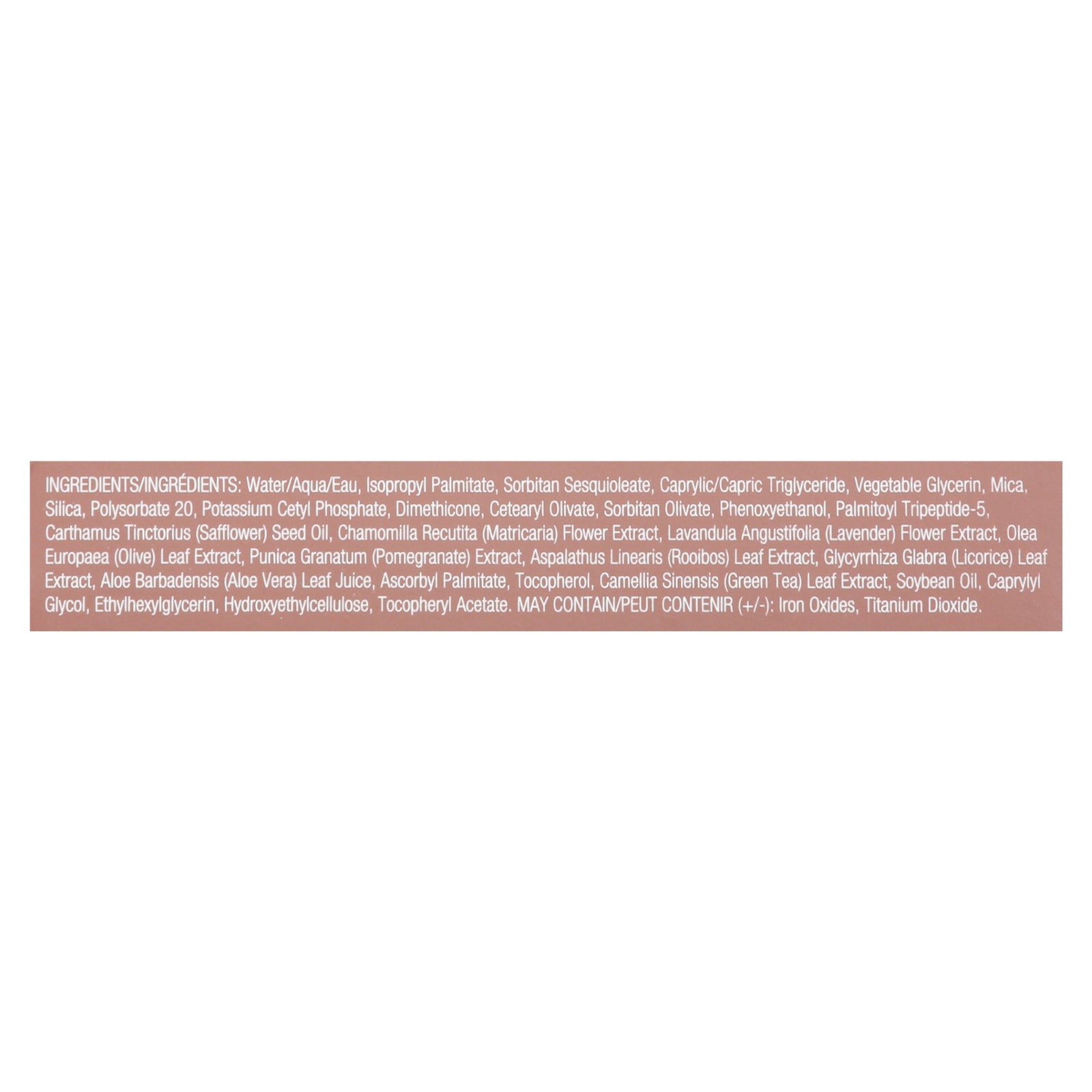 ingredients : water/aqua/eau;isopropyl palmitate;sorbitan sesquioleate;caprylic/capric triglyceride;vegetable glycerin;mica;silica;polysorbate 20;potassium cetyl phosphate;dimethicone;cetearyl olivate;sorbitan olivate;phenoxyethanol;palmitoyl tripeptide-5;carthamus tinctorius (safflower) seed oil;chamomilla recutita (matricaria) flower extract;lavandula angustifolia (lavender) flower extract;olea europaea (olive) leaf extract;punica granatum (pomegranate) extract;aspalathus linearis (rooibos) leaf extract;gly