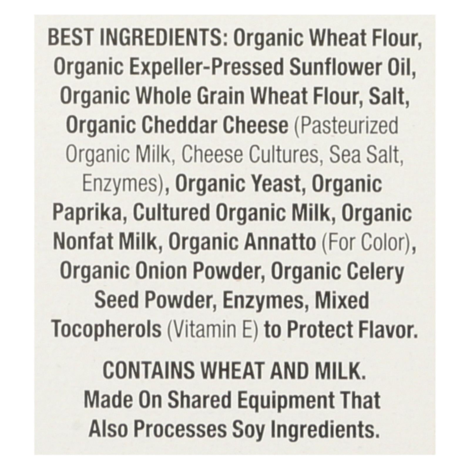 ingredients : organic wheat flour;organic expeller-pressed sunflower oil;organic whole grain wheat flour;salt;organic cheddar cheese;pasteurized organic milk;cheese cultures;sea salt;enzymes;organic yeast;organic paprika;cultured organic milk;organic nonfat milk;organic annatto;for color;organic onion powder;organic celery seed powder;mixed tocopherols;vitamin e;to protect flavor
