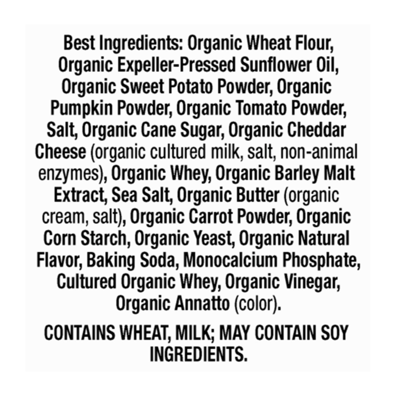 ingredients : organic wheat flour;organic expeller-pressed sunflower oil;organic sweet potato powder;organic pumpkin powder;organic tomato powder;salt;organic cane sugar;organic cheddar cheese (organic cultured milk, salt, non-animal enzymes);organic whey;organic barley malt extract;sea salt;organic butter (organic cream, salt);organic carrot powder;organic corn starch;organic yeast;organic natural flavor;baking soda;monocalcium phosphate;cultured organic whey;organic vinegar;organic annatto (color)