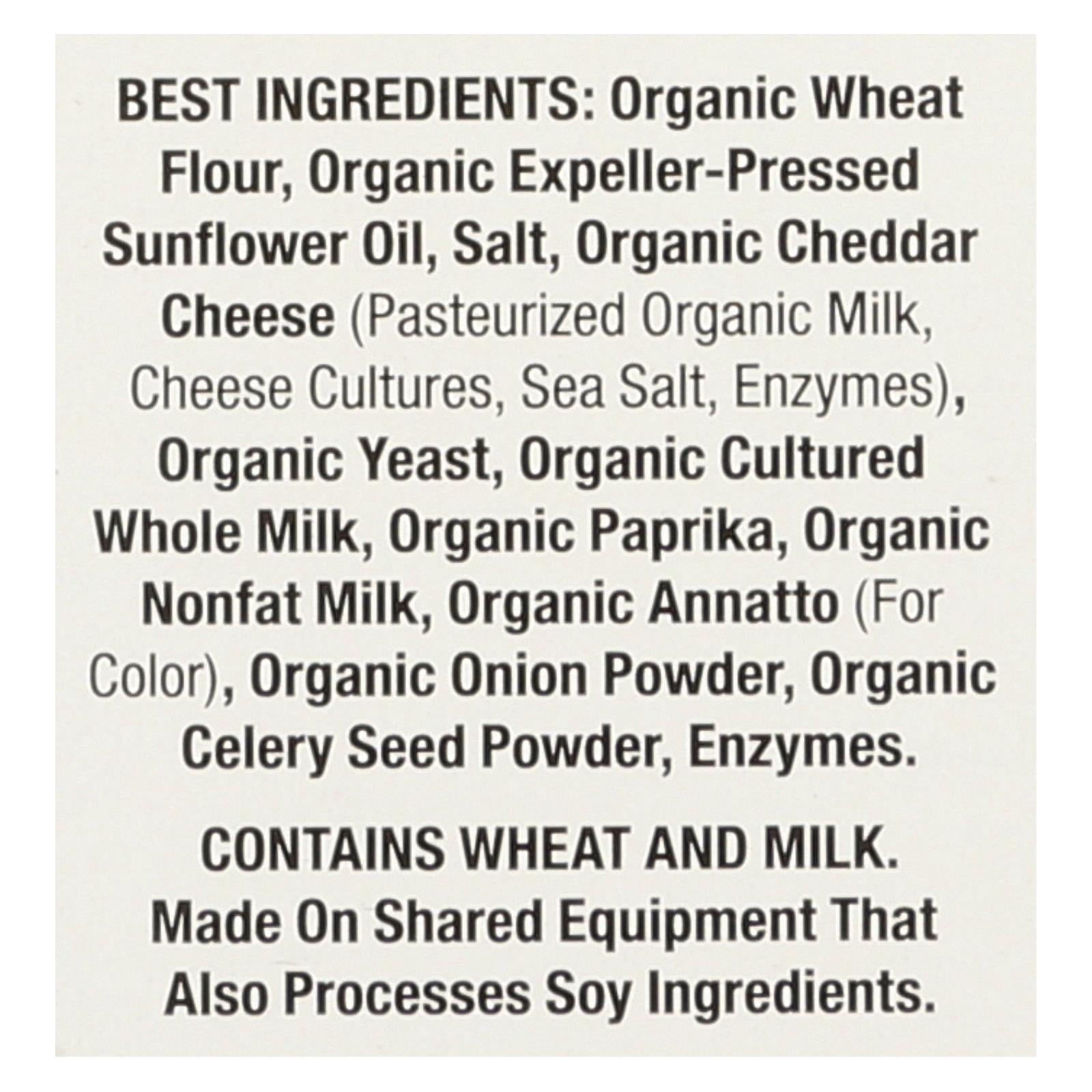 ingredients : organic wheat flour;organic expeller-pressed sunflower oil;salt;organic cheddar cheese;pasteurized organic milk;cheese cultures;sea salt;enzymes;organic yeast;organic cultured whole milk;organic paprika;organic nonfat milk;organic annatto;for color;organic onion powder;organic celery seed powder